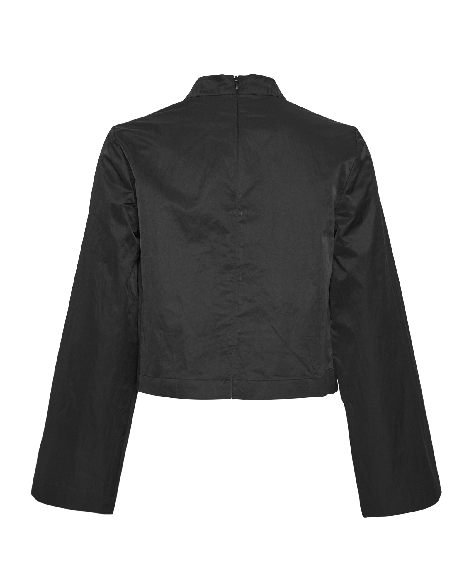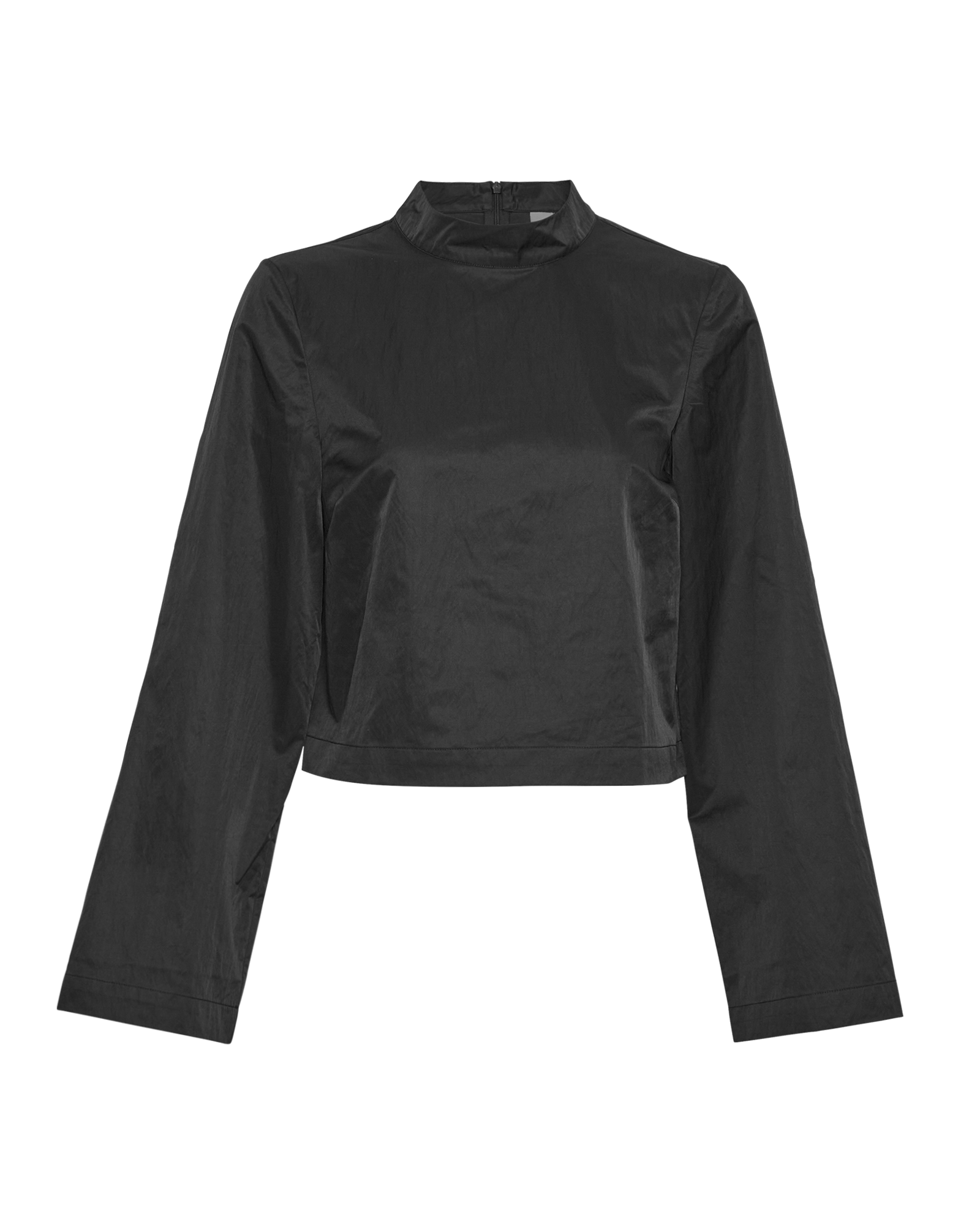 Camilla toppen er designet af den danske model og influencer Cecilie Haugaard. Toppen er en kort model med bred pasform, lange ærmer og høj hals. Den lukkes i nakken med lynlås og har en lille slids nederst bagpå. Kvaliteten har en anelse shine.