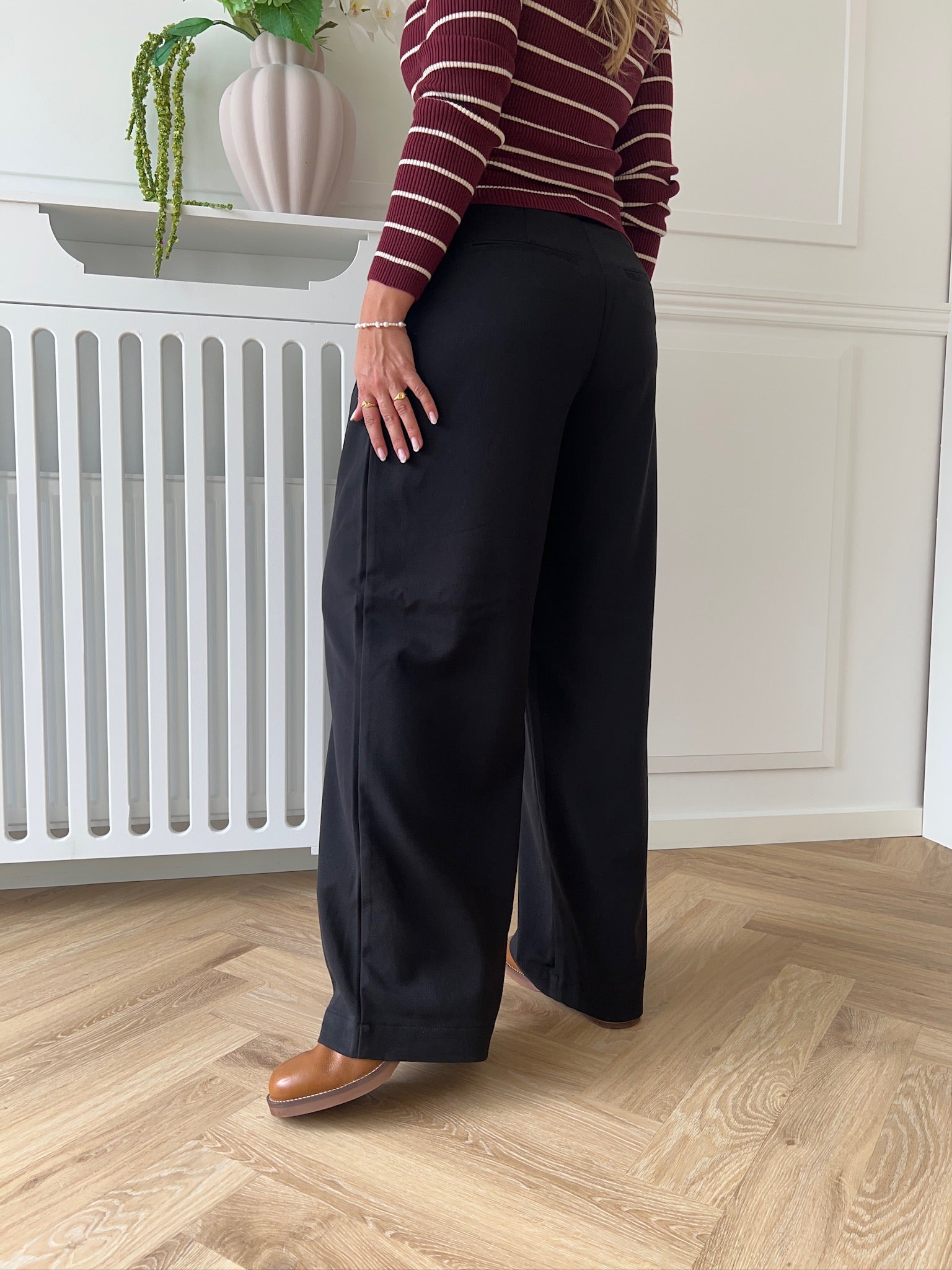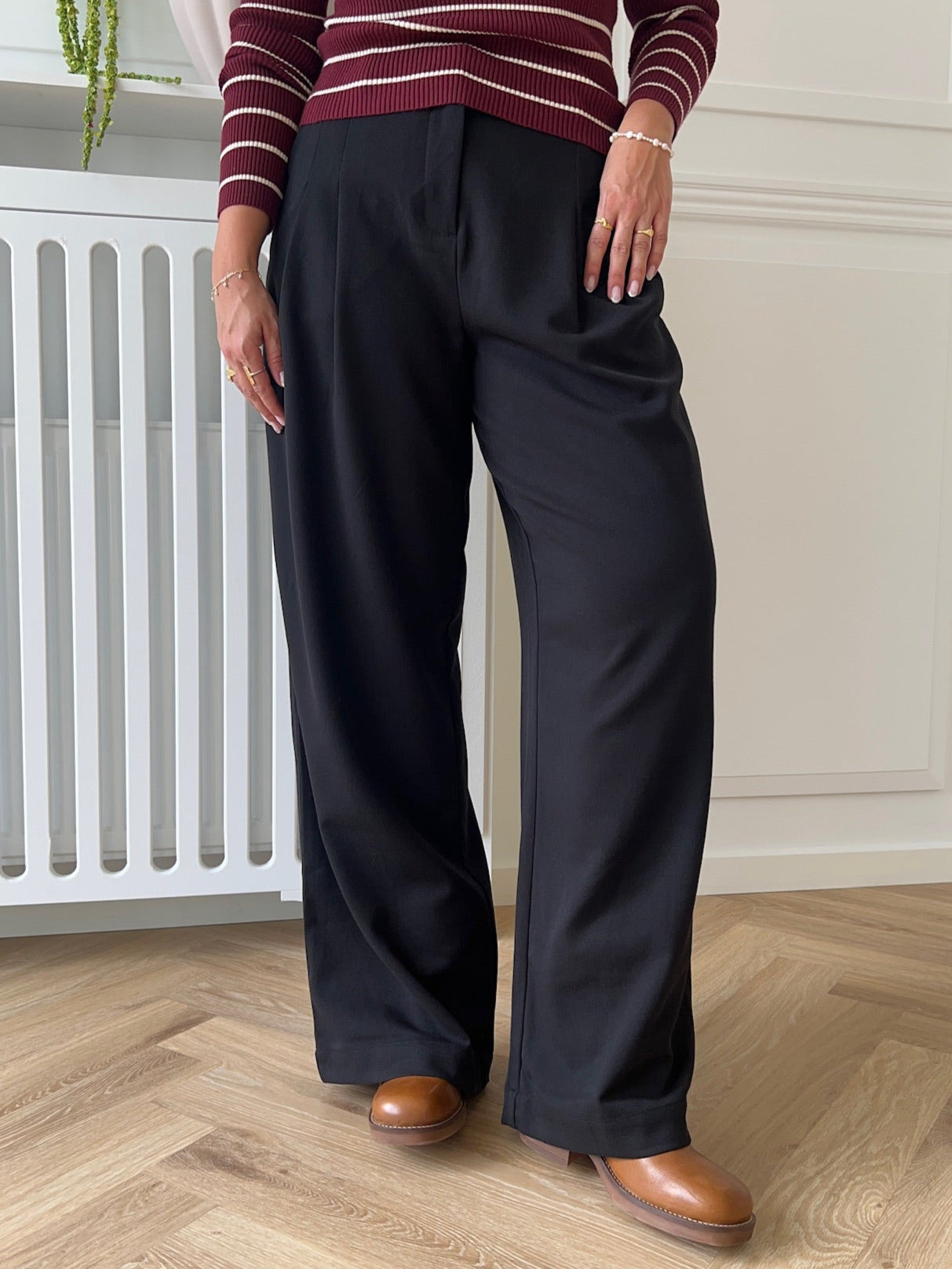 Henrika er et par klassiske bukser med vid pasform. De har fast linning, bæltestropper og lynlåslukning. Derudover har de vidde i benene og læg foran.