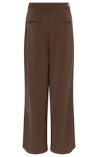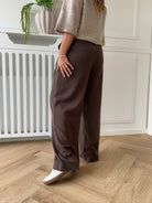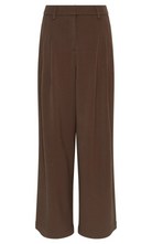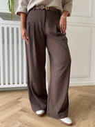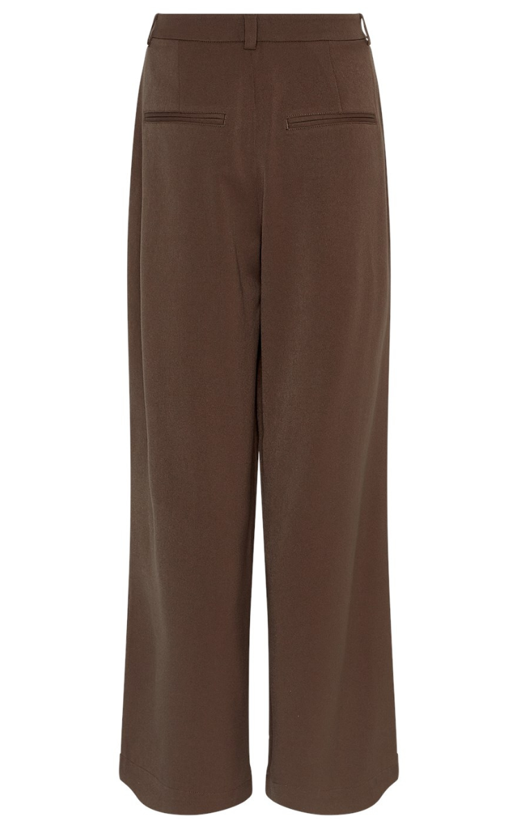 Henrika er et par klassiske bukser med vid pasform. De har fast linning, bæltestropper og lynlåslukning. Derudover har de vidde i benene og læg foran.