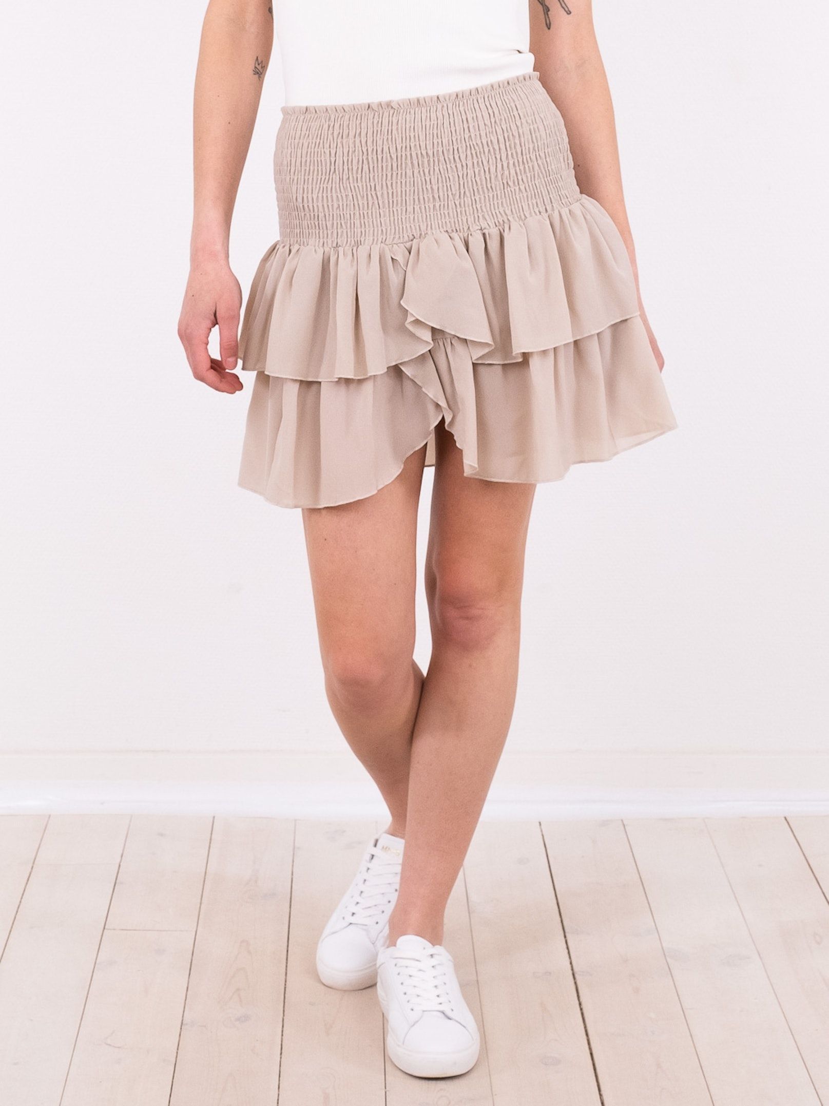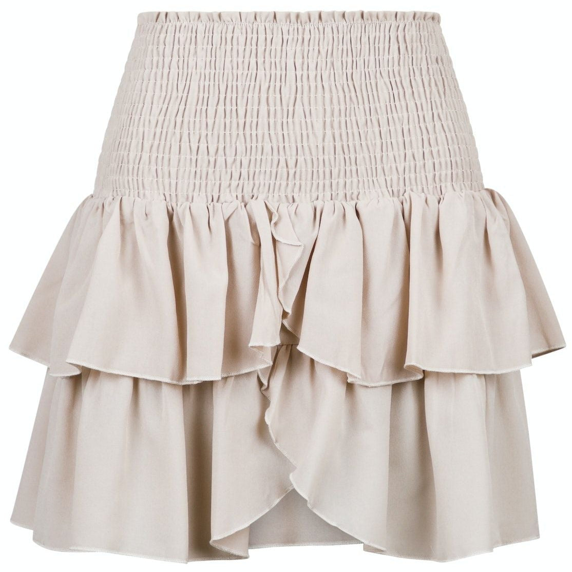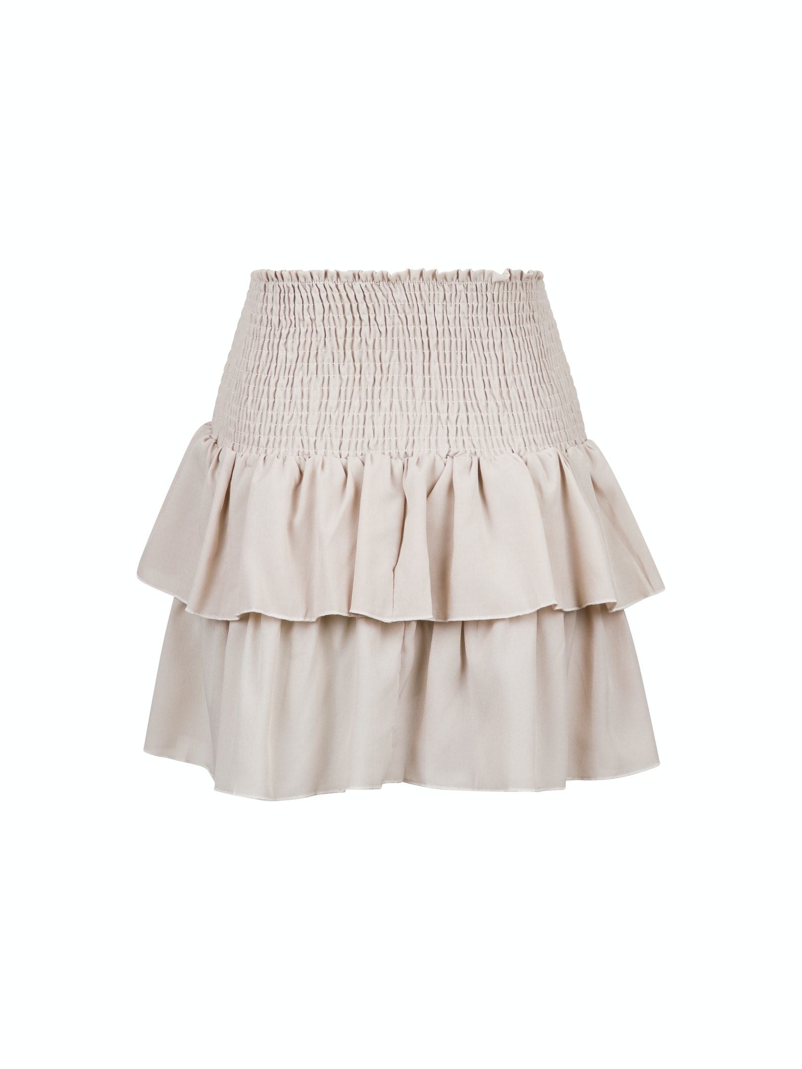 Sød, kort nederdel med to lag flæser og slids foran. Nederdelen har smock samt elastik i taljen og pasformen er både smuk og komfortabel.