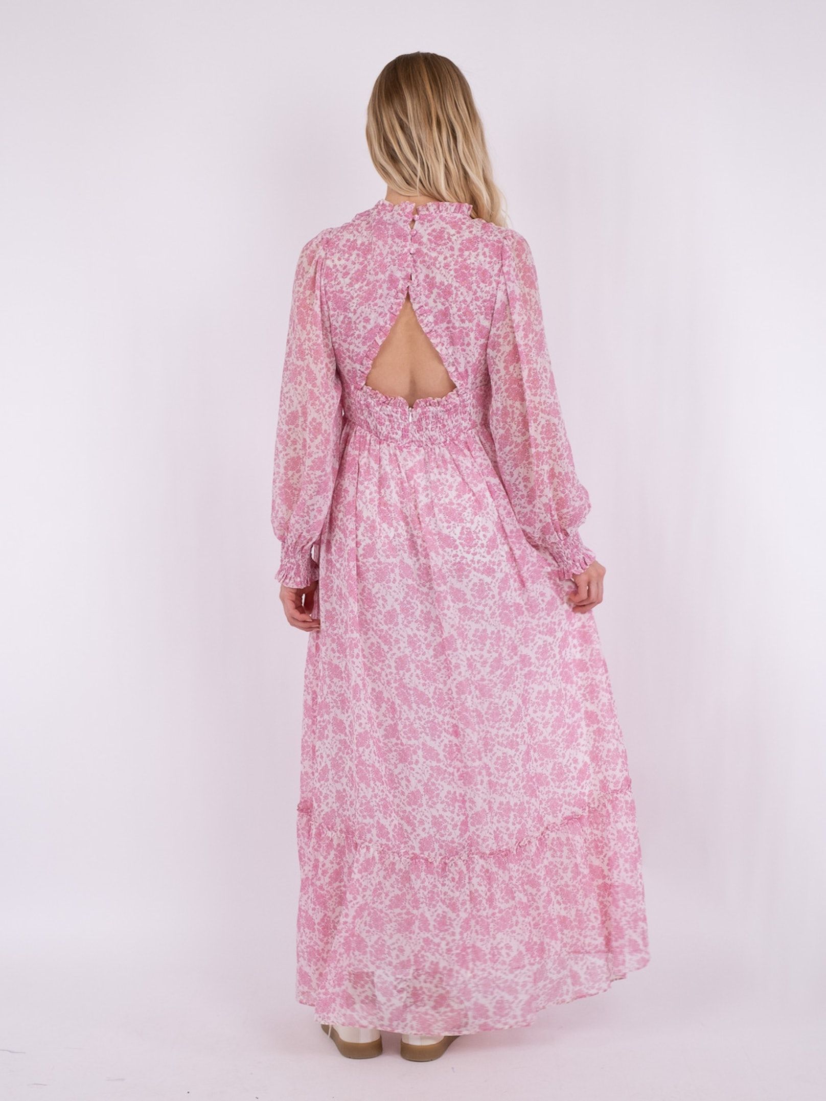 Smuk, lang kjole med åben ryg og mange flotte detaljer. Underdelen har en masse flæser, mens overdelen har puf-ærmer og v-hals foran. Kjolen er taljeret, hvilket fremhæver kroppen smukt. Kvaliteten er let og med et fint blomster print.