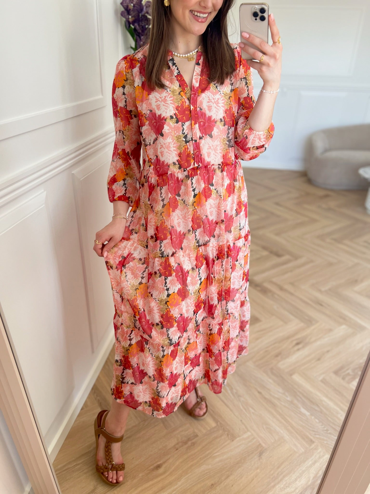 Sød kjole i en let kvalitet i et smukt blomster print. Kjolen har 3/4 ærmer og en flæse i bunden. Pasformen er semi-løs og samtidig flatterende.