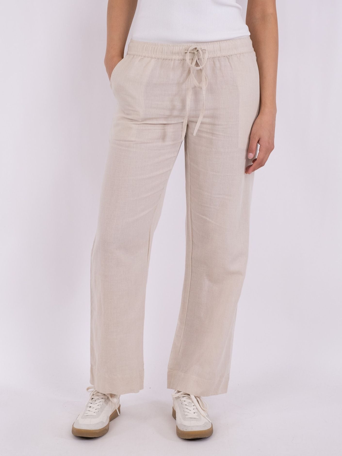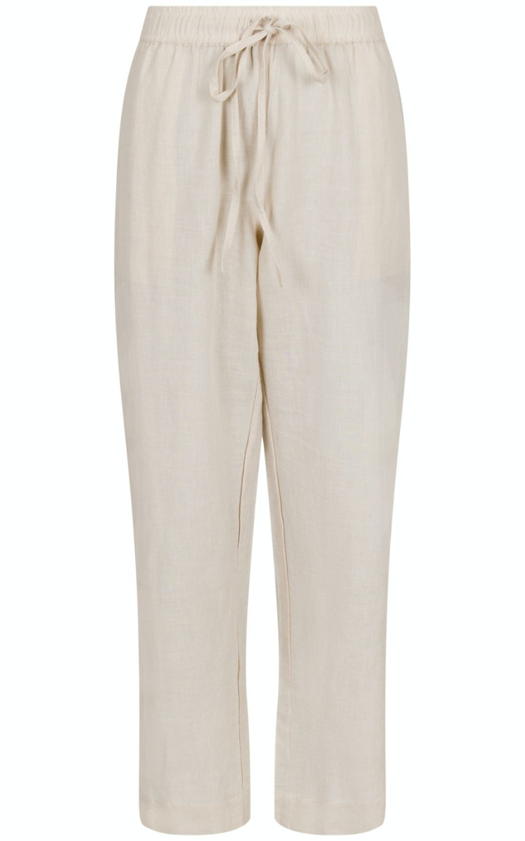 De lækreste bukser i hør-mix i den fineste klassiske farve, som er nemme at style. Bukserne har brede ben og elastik i bindebånd i taljen.