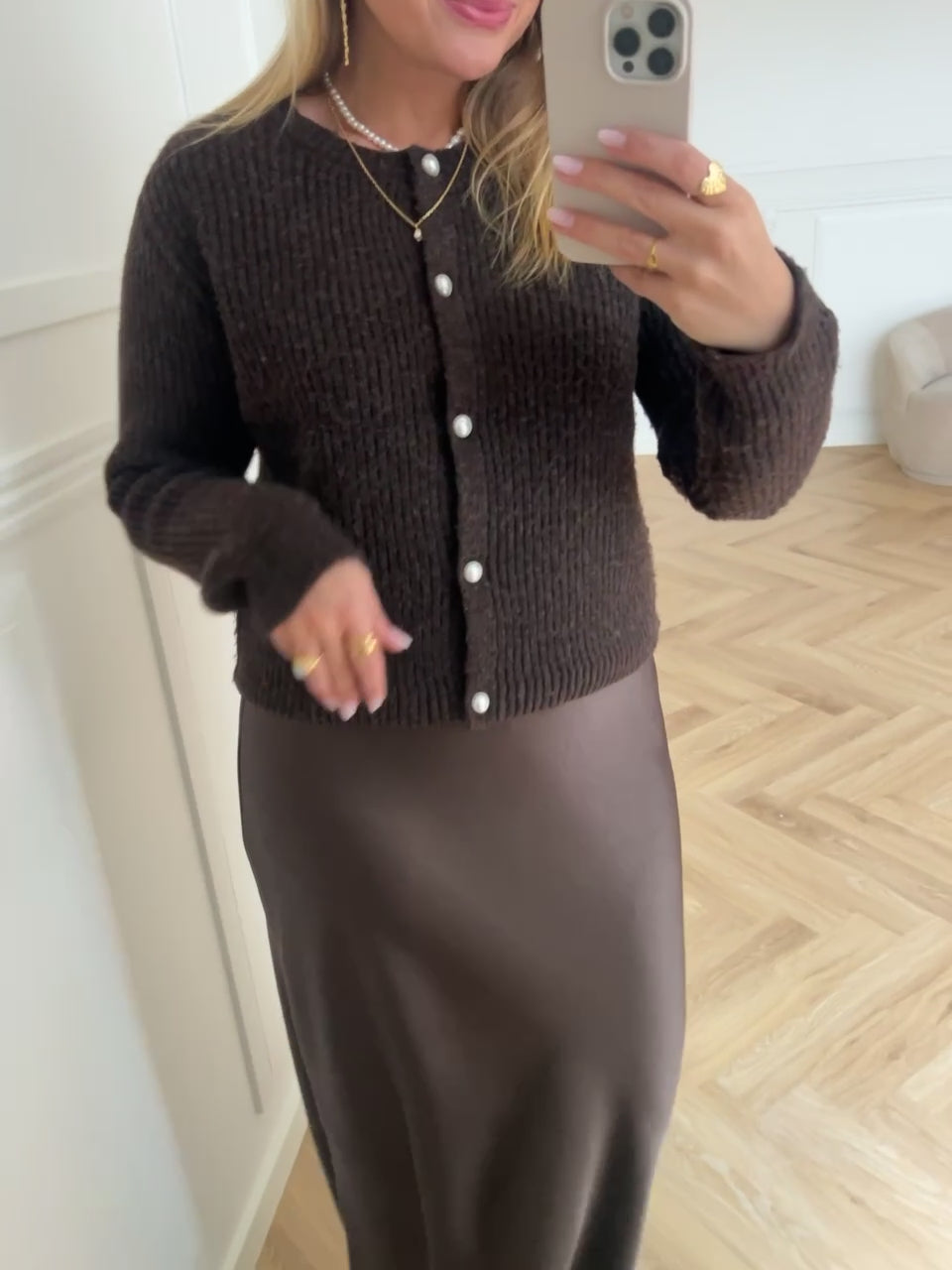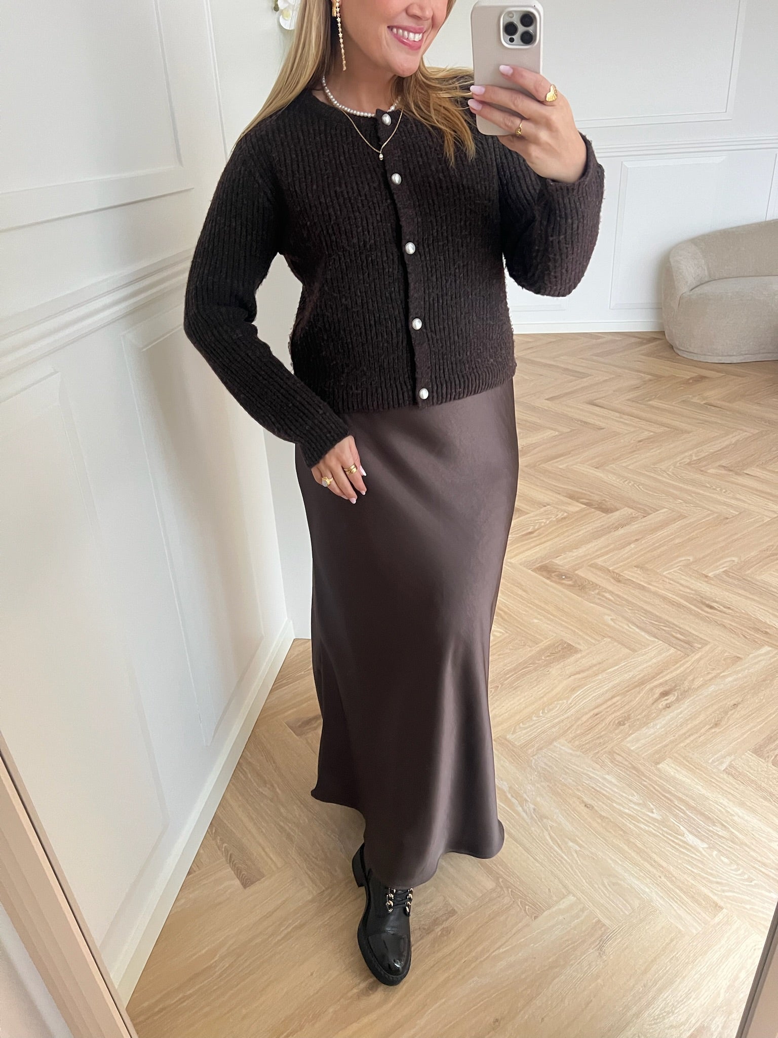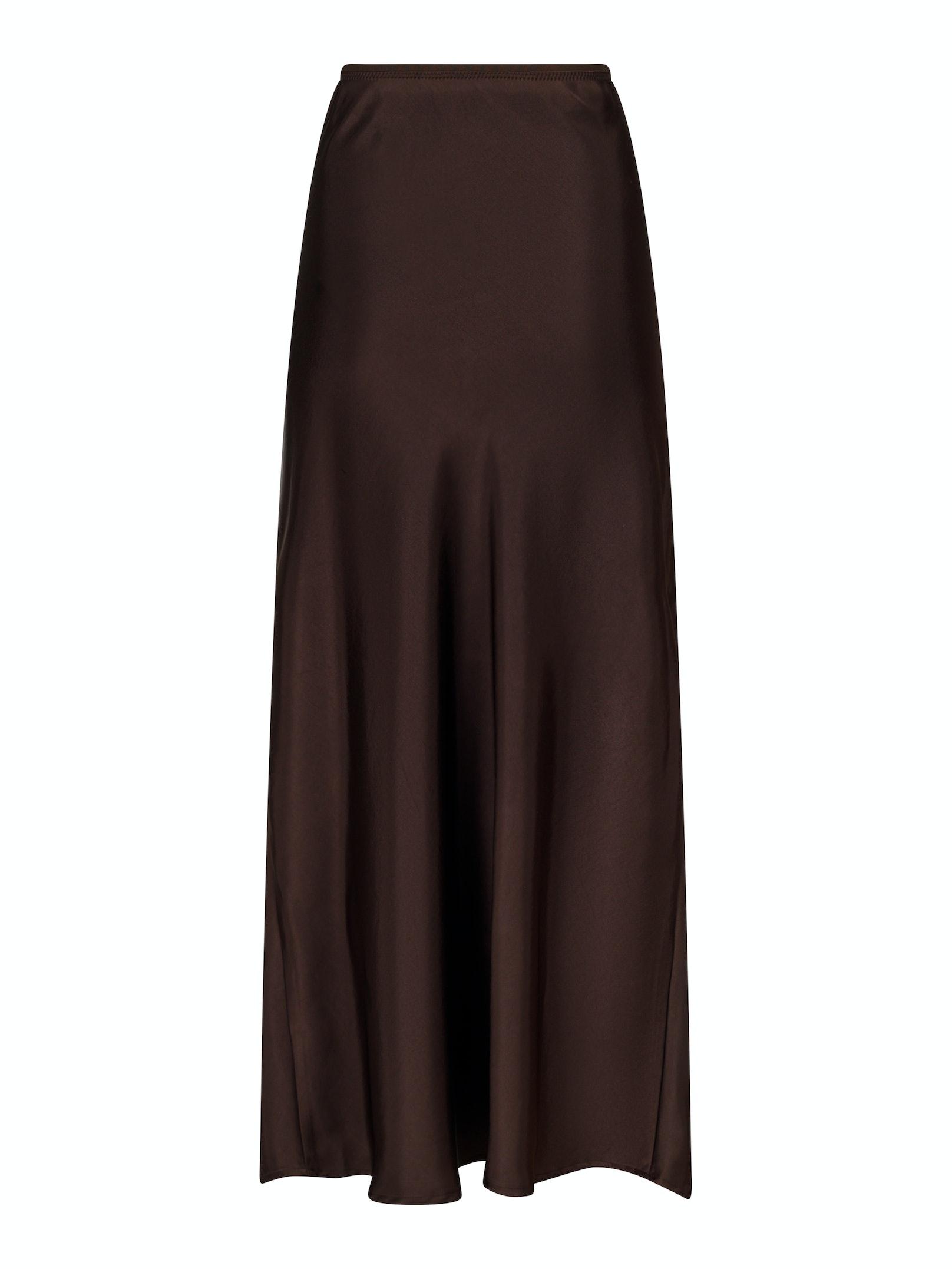 Vildt flot lang nederdel fra Neo Noir i Mørkebrun. Nederdelen har elastik indvendigt i taljen og er fremstillet i en lækker blød satinkvalitet, der falder smukt.