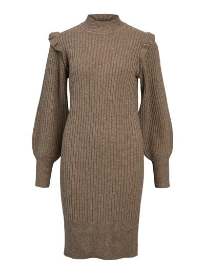 Lækker strikkjole fra Object i en superblød kvalitet, der ikke kradser. Kjolen har høj hals, semi-tætsiddende pasform og midi-længde. De lange ballonærmer har fine flæsedetaljer og afsluttes med en tætsiddende kant nederst ved armen.