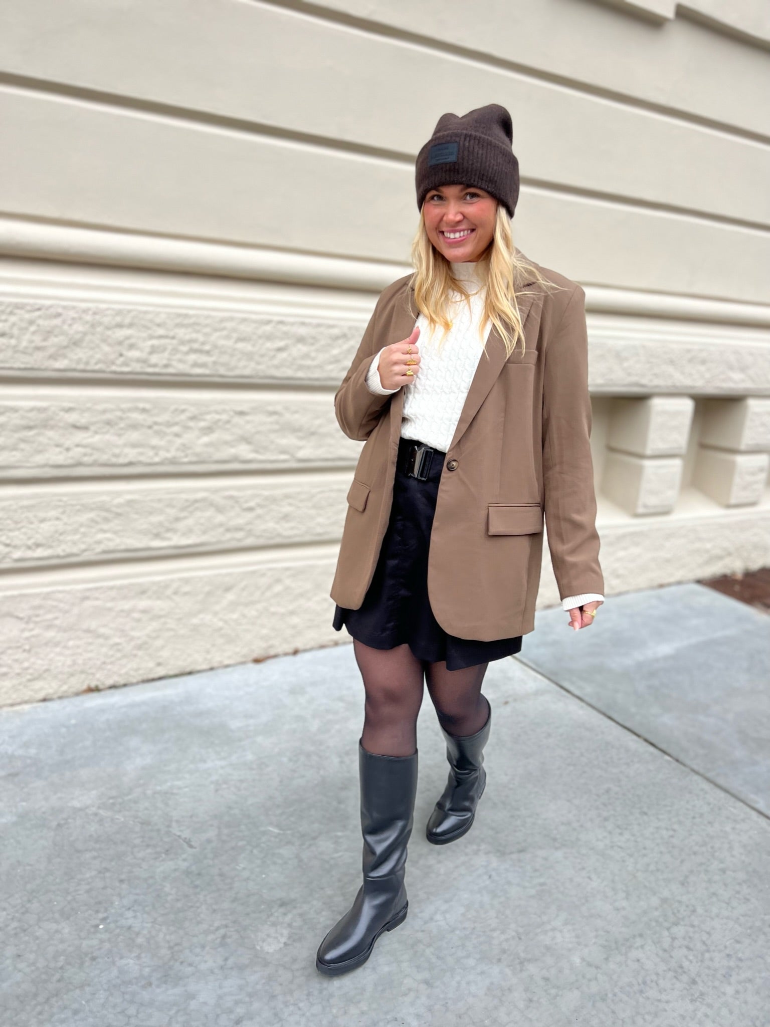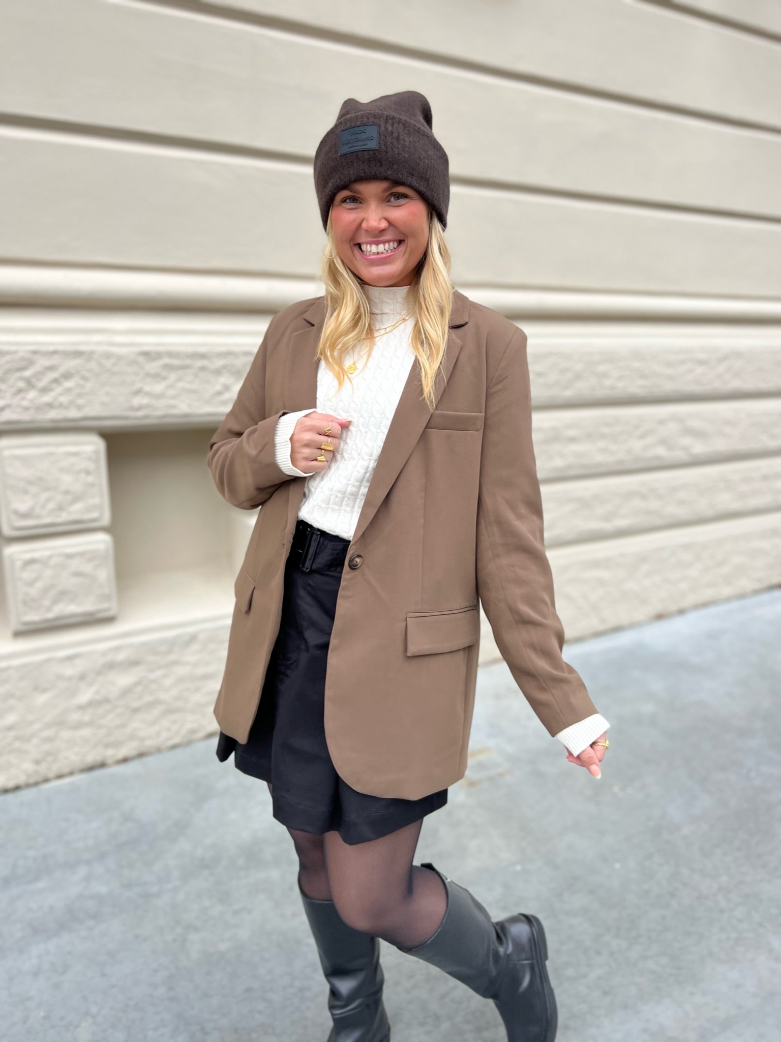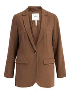 Denne super lækre Blazer er lavet i en flot, brun nuance. Blazeren har en smule længde og har desuden et klassisk snit med reverskrave, skulderpuder og lange ærmer.