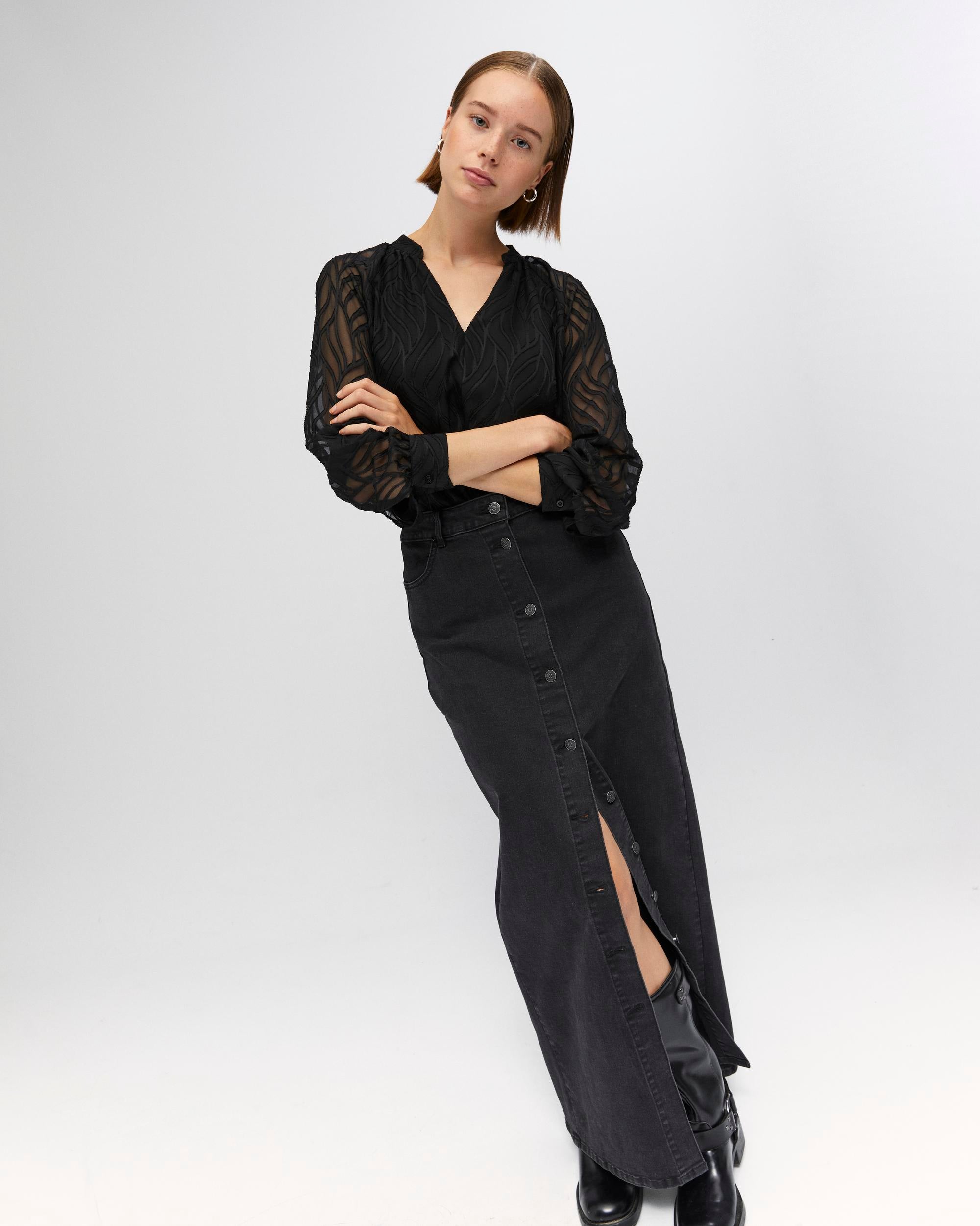Den fineste denim nederdel i sort denim, men knappelukning hele vejen ned som giver mange stylingsmuligheder.