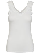 Super sød basistop i en klassisk hvid med blonder. Den har tætsiddende pasform og v-hals med en flot blondedetalje, der indrammer toppen på fineste vis. Den er yderst behagelig at have på og er perfekt indenunder en strik, en cardigan eller en blazer.