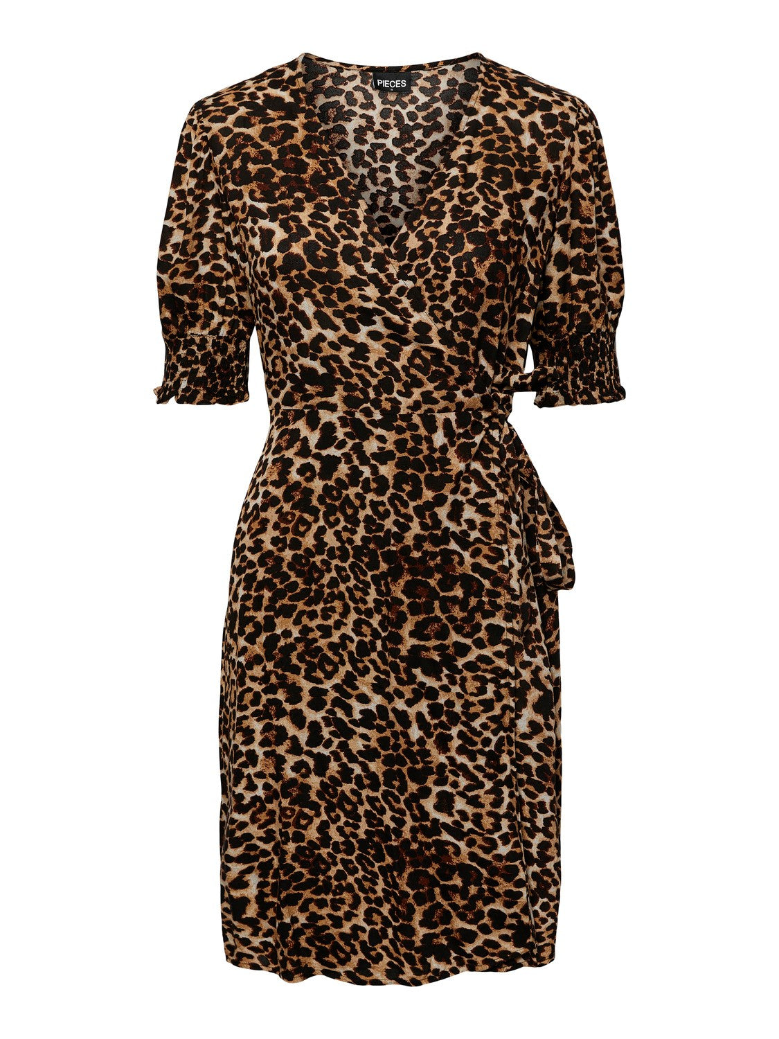 Let og flot slå-om kjole med korte pufærmer og v-udskæring. Kjolen er en kort model med bindebånd i taljen og fine elastikdetaljer ved ærmerne. Den er fremstillet af 100% Viskose, hvilket gør den blød og let. Denne udgave har et klassisk leo-print, som altid er et sikkert hit. Den findes også med et smukt blomsterprint lige her