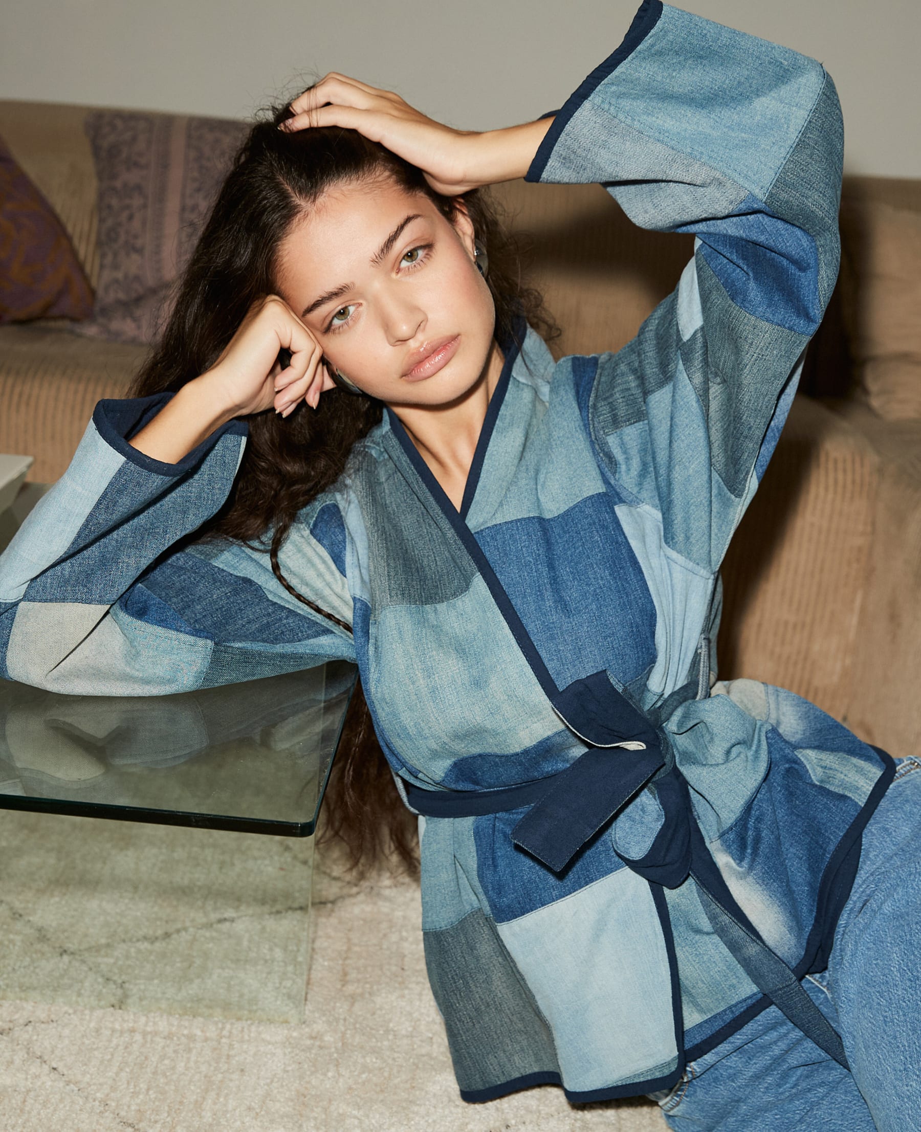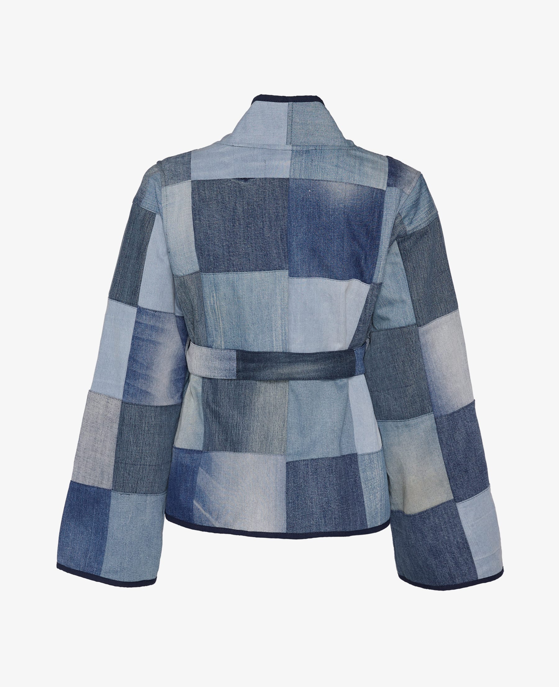 Super cool denimjakke med patchwork effekt, som har en feminin pasform med bindebælte. Den er fremstillet af denimrester fra anden tøjproduktion, hvilket giver den det unikke og seje patchwork look.