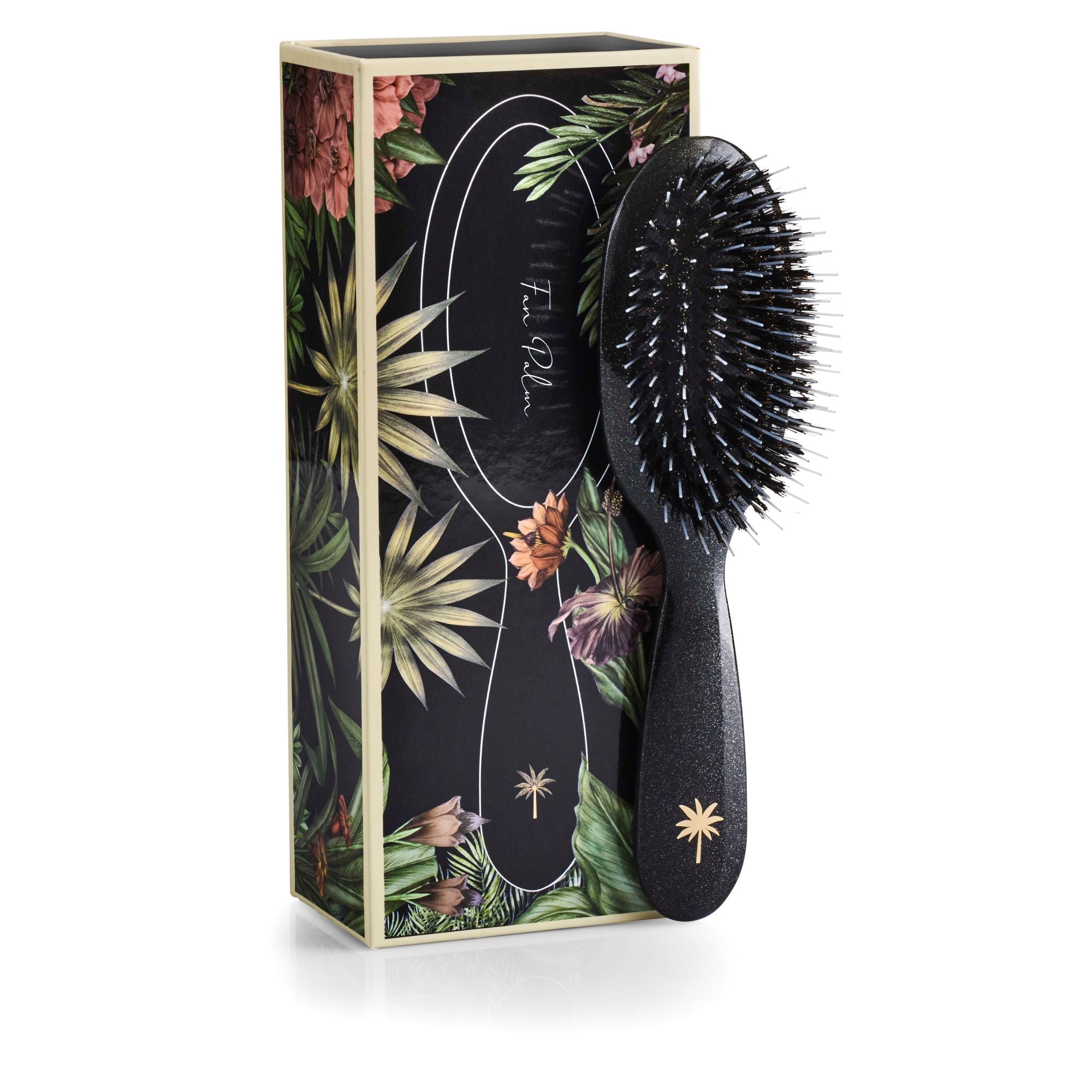 Small Hair Brush Stardust fra Fan Palm er en luksuriøs hårbørste, som består af en kombination af bløde vildsvinehår og nylon. Kombinationen formår at gå ind og stimulerer hovedbunden, samt får transporteret hårets naturlige olier ud i resten af håret.