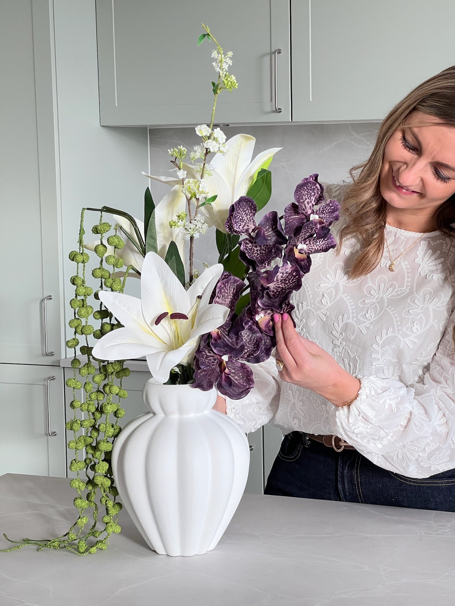 Indeholder: 1 x Lilje Large White, 1 x Orchid (Seven Heads) Burgundy, 1 x Hanging Branch No. 3 Green, 1 x Fontanesia White.